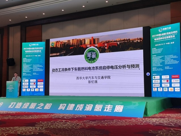在此次大会上,西华大学汽车与交通学院教授、汽车测控与安全四川省重点实验室主任彭忆强做了题为《动态工况条件下车载燃料电池系统启停电压分析与预测》的主旨报告,介绍了新能源及智能车辆团队近期在氢能及燃料电池车辆方向的研究成果,团队成员杨继斌副教授主持当天上午会议下半场。此外,此次会议会场外,西华大学汽车与交通学院新能源及智能车辆团队设立展台,介绍并展示了汽车与交通学院的概况及团队的研究成果。