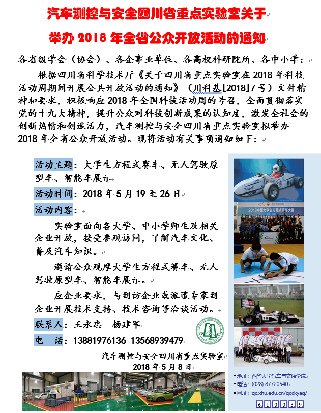 汽车测控与安全四川省重点实验室关于举办2018年全省公众开放活动的通知