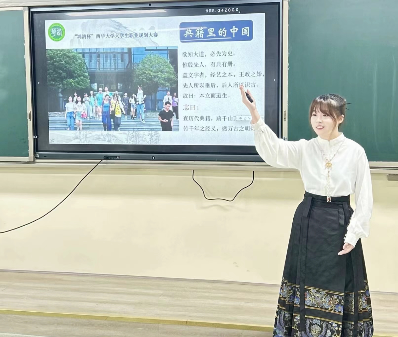 在决赛环节中,程飞羽以“中国古典文献研究与整理工作”为主题展开主题陈述环节,思路清晰,声情并茂,台风稳健,充分展现了文新学子的风采。在陈述的结尾环节,程飞羽用一首诗朗诵《典籍里的中国》坚定地表达了对文献工作的向往与热爱,激起现场观众席热烈的掌声。在评委提问环节中,程飞羽现场应变沉稳,语言表达清晰,逻辑思维明确,博得评委老师的一致好评,展现了出彩的个人能力。最终经过激烈角逐,程飞羽荣获西华大学2024年“鸿鹄杯”大学生职业规划大赛决赛(成长赛道)金奖。