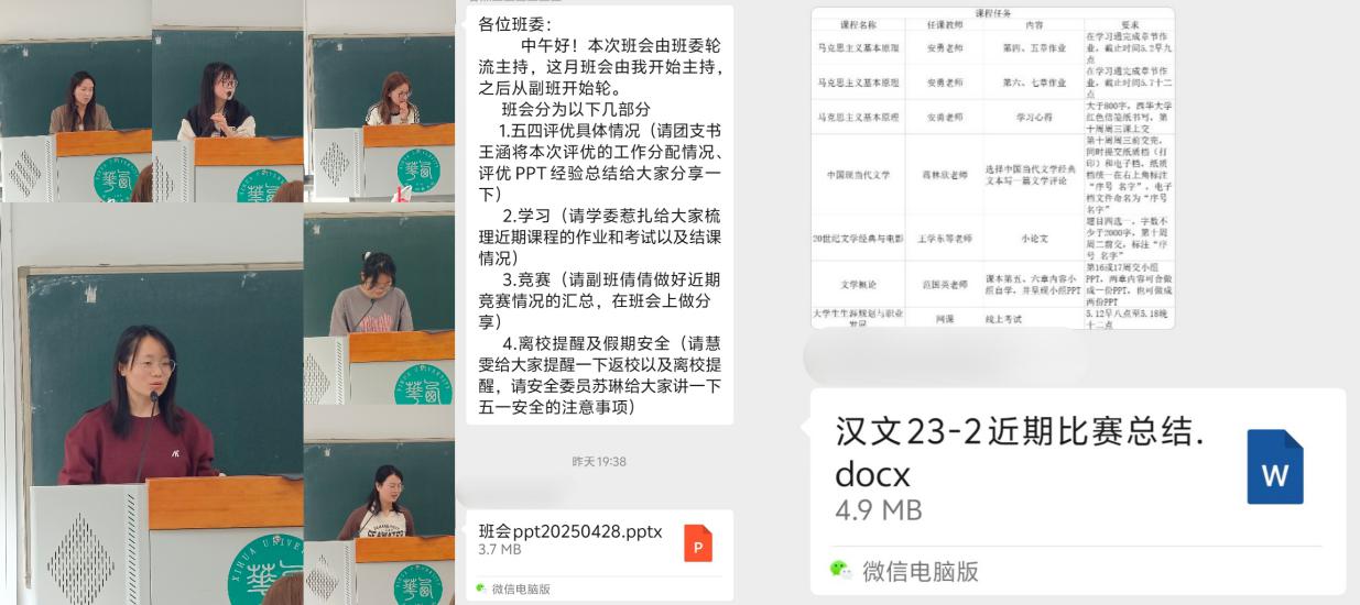 4月28日中午,汉文23-2班在6A-120教室召开四月主题班会。本次会议由班长李春燕主持,围绕五四评优总结、学业规划、竞赛动员、假期安全等内容展开,通过班委分工协作的方式高效推进,充分展现了班级团队的凝聚力与行动力。