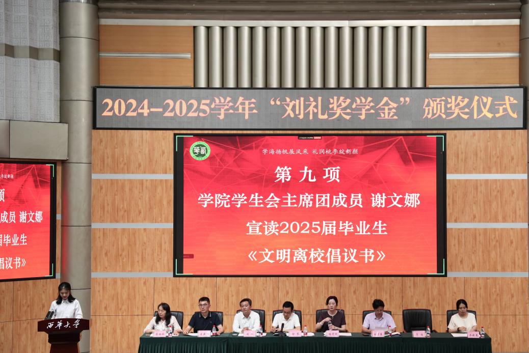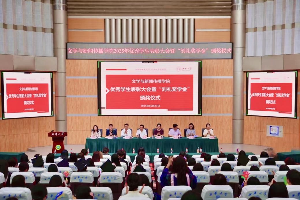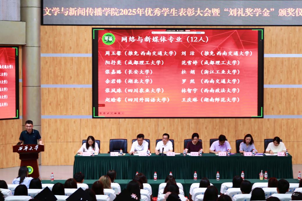 2025年5月23日中午,西华大学文学与新闻传播学院在四教报告厅隆重举行2025届优秀学生表彰大会暨“刘礼奖学金”颁奖仪式。学院党委书记张雯欣、学院副院长王学东、副院长范佳、学院优秀校友刘礼、中文系主任王燕飞、传媒系主任乔晓英、中文系副主任蒋林欣以及宜宾校区参会的老师出席会议。全体辅导员、获表彰的同学代表、毕业生优秀代表、各年级同学代表参加会议,学院党委副书记徐攀主持会议。