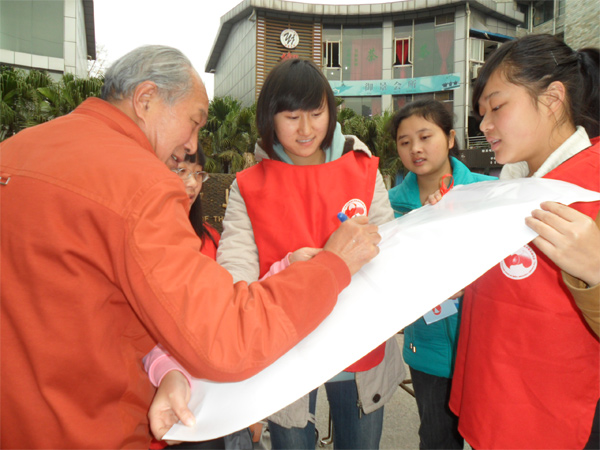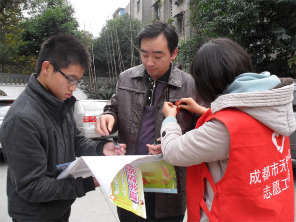 志愿者们手臂上系着红丝带,挂上会旗,拉开写有“让‘艾’远离,让‘爱’伴行”的宣传横幅,一边分发宣传单,一边向社区群众和过往行人宣传防艾知识,并给他们系上红丝带,让大家加入到防艾的队伍中来。  宣传取得了良好的效果,许多市民积极签名,并表示会用行动关心与支持艾滋病病毒感染者和病人,会用“心”来参与艾滋病防治工作。