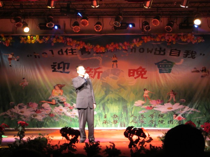 12月2日晚7:00,学生活动中心人声鼎沸,座无虚席,人文学院“HOLD住青春,SHOW出自我”迎新晚会拉开帷幕。本场晚会的嘉宾有人文学院党委书记兼副院长王大清、院长谢应光、党委副书记兼副院长张雪征、副院长潘殊闲、副院长冯永泰、各系系主任、辅导员及部分任课教师。全体2011级新生观看了此次晚会。  晚会开始前,学院领导通过VCR视频向学院全体2011级新生表示热烈的欢迎,并寄语同学们:要学会学习,学会做人,学会自理自立,学会关心他人,树立健康的人生观和高远的人生目标;懂得珍惜、关爱、感恩和坚强;要通过对本专业知识的学习,不断充实自己,成长为对社会有用的人。  大幕拉开,活力四射的啦啦操开场舞将现场气氛迅速点燃,四位来自不同年级的美女主持人依次亮相,倒数声中晚会正式拉开帷幕。晚会由“炫青春风”、“展缤纷情”、和“筑未来梦”三个板块组成。与往年不同的是,今年晚会特别引入微博评论,新增观众互动抽奖环节,更有书记王大清老师豪情演唱《滚滚长江东逝水》和院长谢应光老师深情朗诵《致橡树》倾情助阵。其间,藏彝同胞带来的歌舞节目、劲爆火辣的流行歌曲串烧,活力耀眼的街舞<POWER>,另类风格的反串小品《白雪公主》、《优乐美来了》等节目依次登台亮相。来自学生会主席团深情演绎的穿越爱情故事和最后压轴的《SHOW出自我》部长T台走秀引爆全场,他们的亮相让晚会现场高潮迭起,全场欢呼声、尖叫声不断。  晚会结束,学院领导与演员、工作人员合影留念。晚会体现了人文学院对2011级新生的热情欢迎,也表达了对他们美好的祝福。