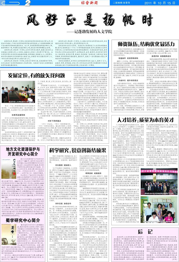 2011年10月15日的《西华大学报》在第二版对我院的发展情况作了专版报道。报道主要介绍了学院的发展定位、科学研究、师资队伍和人才培养情况,并对地文化资源保护与开发研究中心和蜀学研究中心做了简介。风好正是扬帆时(西华大学校报二版)点击下载此文件