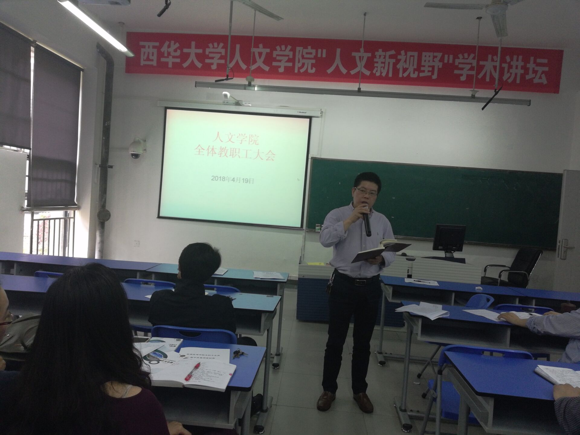 419日下午,人文学院党委在6A-126召开落实全面从严治党工作会,全体教工党员参加,会议由党委副书记徐攀主持。