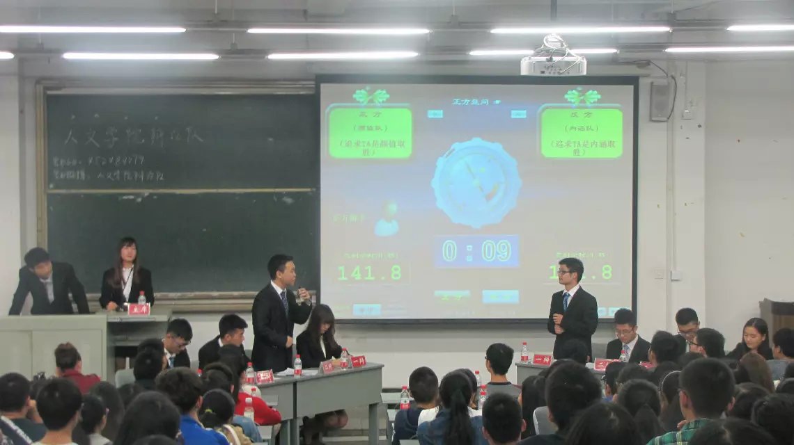 10月8日晚,人文学院辩论队在6B-107举办以“追求TA是靠颜值还是内涵取胜”为辩题的新生表演赛,2015级辅导员秦婷及各兄弟学院辩论队代表作为嘉宾列席旁听。