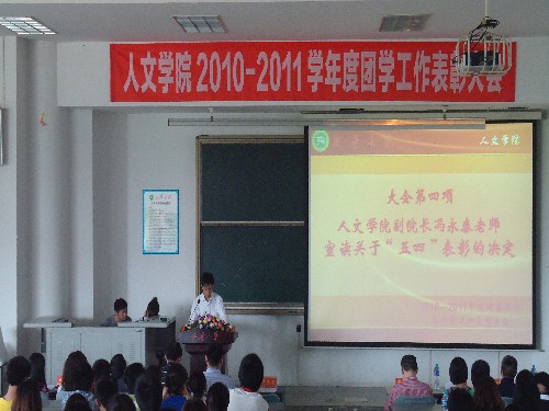 2011年5月5日中午,西华大学人文学院2010-2011年度团委工作总结暨五四表彰大会在5C-204隆重举行。人文学院党委委员、副院长冯永泰,党委委员、党政办主任王方,教学办主任曾海田,法学系、历史系、教育科学系主任杨廷文、官性根、曾英,辅导员徐薇、廖秀美,及团委书记王馨和副书记赵韦韦等学院领导和老师出席大会。学院学生会副主席陈静主持大会。