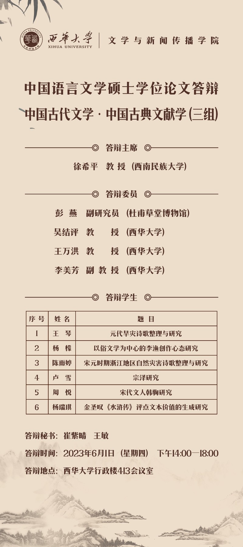 中国语言文学硕士学位论文答辩 中国古代文学·中国古典文献学(三组)