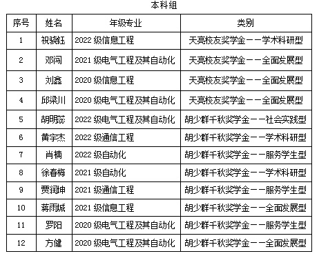 附:“天亮奖学、奖教金”是我院93级校友、深圳市鼎信科技有限公司总经理张天亮为资助学院优秀学生、优秀教职工捐赠设立,“胡少群千秋奖学金”是我院01级电子信息工程专业毕业生、上海百秋电子商务有限公司联合创始人胡少群为资助我院优秀学生捐赠设立。