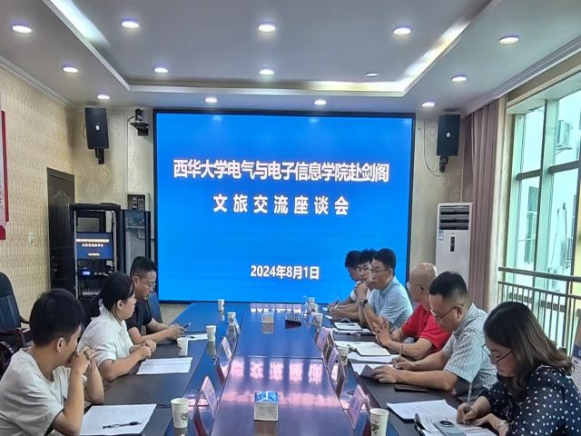 8月1日,学院代表团赴广元市剑阁县与广元市文化广播电视和旅游局、剑阁县文化广播电视体育和旅游局齐聚一堂,召开了交流座谈会,正式开启为期两天的剑阁调研之旅。本次参会人员为学院党委副书记郭忠林,专业实验中心主任、校新能源与微电网科普基地负责人孙章,辅导员蓝琼及学生代表共8人,广元市文化广电旅游局党组成员、副局长周明雄,市文化广电旅游局公共服务科科长陈燕及剑阁县文广体旅局干部共7人。此次活动旨在通过深化合作、协同创新,共同探索合作共赢的新路径。