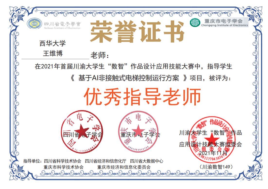 本届竞赛共有来自四川和重庆35所高校的293支参赛队1307人参加,共评选出“基于STM32的智能穿戴设备”、“高精准多功能计数器”等8个特等奖,“半主动激光跟踪系统”、“云控千里——国内领先的发电机组智能安全管家”等15个一等奖。由西华大学电气与电子信息学院王维博老师指导我院学子《基于AI非接触式电梯控制运行方案》的项目荣获佳绩。
