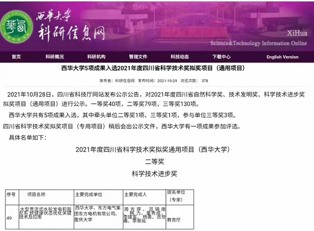 近日,西华大学电气与电子信息学院范镇南副教授凭借“大型贯流式水轮发电机阻尼系统健康状态优化关键技术及应用”与“大型贯流式水轮发电机阻尼系统故障抑制关键技术及其应用”两项成果,分别荣获“四川省科技进步二等奖”与“中国机械工业科学技术奖科技进步”三等奖的表彰。