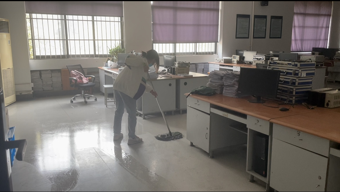 当日下午,志愿者在电气学院实验室教师余建华的带领下分为多个小组,进入不同实验室进行卫生清理活动,包括抹、扫、拖和归置等细致工作。志愿者在服务过程中都抱着极高的劳动热情和一丝不苟的态度。