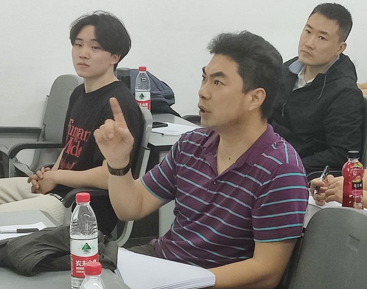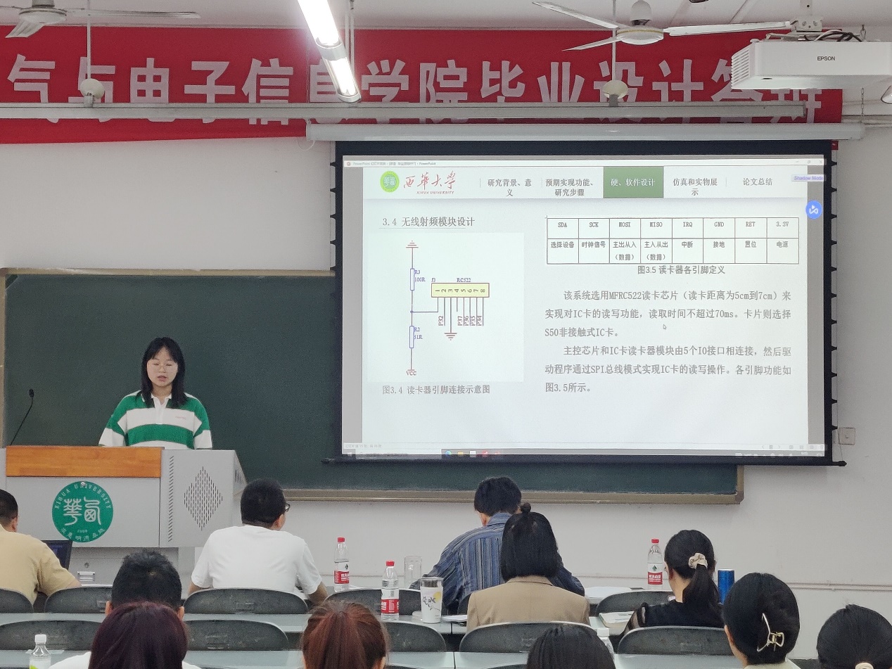答辩期间,一方面同学们按照安排依次上台讲解自己的设计内容、展示设计成果、分享工作经验,并回答评审教师的提问;另一方面评审教师通过聆听同学们的讲解、查看设计资料和提问,综合评判学生设计的完成情况和完成质量,逐一指正设计中存在的问题与不足,并给出相应的改进意见。