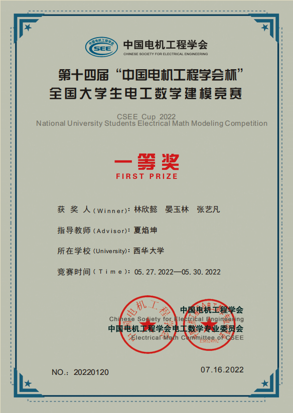 近日,第十四届“中国电机工程学会杯”全国大学生电工数学建模竞赛完美落下帷幕。本次比赛有406所高校参与,3818队选手提交了有效论文,获奖队数共计1744队,获奖队伍比例为45.68%。我校学子在各位指导教师带领下,积极思考,团结协作,最终喜获国家级一等奖3项、二等奖5项、三等奖20项的优异成绩。