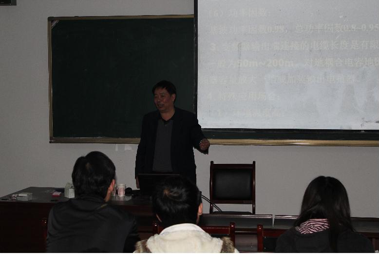 11月19日下午4点,大陆希望集团森兰科技公司副总工程师杜俊明来校作了题为“变频调速系统变频器的设计选型”的学术报告。报告会在6A-314教室举行,由电气信息学院邱晓初老师主持,电气信息学院院长王军及部分师生聆听了报告。 杜俊明高工首先简要介绍了变频器的作用、调速的主要指标、变频器应用系统的设计、变频器的选用件等,然后介绍了近年来所做的变频系统实例以及变频器产业的发展前景。 会后,杜总与在座师生进行了亲切交谈,向师生们介绍了做工程项目的一些经验和方法。杜总工程经验十分丰富,深入解答了在座学生提出的实际问题,引起了在场师生的强烈兴趣。