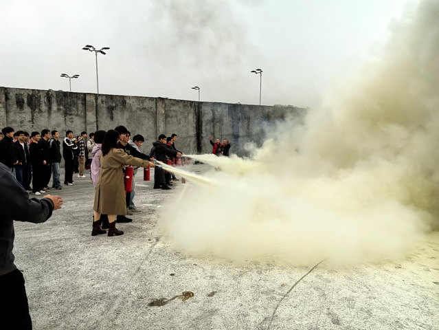 孙鹏老师首先带领大家进行消防理论知识学习。他详细介绍了火灾的常见类型、火灾发生的原因以及如何预防火灾发生,以及如何正确使用一些电器设备等,例如我们生活中最常用的电源插座,强调在使用电器时切忌负荷使用并且在其周围不要存放易燃、易爆的物品,外出时要关闭电源开关,以免发生火灾。随后他带领大家认识了报警或警报标志,讲解示范如何正确使用灭火器。关于灭火器的正确使用,主要可分为“一提二拔三握四压”,即在使用前首先要将灭火器提起来,拔开铁制的拉手,然后握住灭火器的喷嘴,最后按压灭火器的把手来灭火。