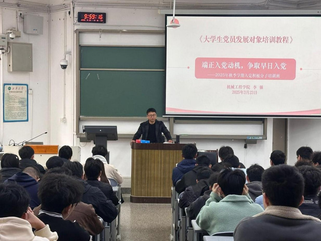 点击:15 为认真贯彻落实《中国共产党发展党员工作细则》,提升入党积极分子的党建意识与思想教育,端正入党动机。2025年3月23日,机械工程学院党委副书记、纪委书记李强以“端正入党动机,争取早日入党”为主题,为学院2025年春季学期入党积极分子学员们讲党课。