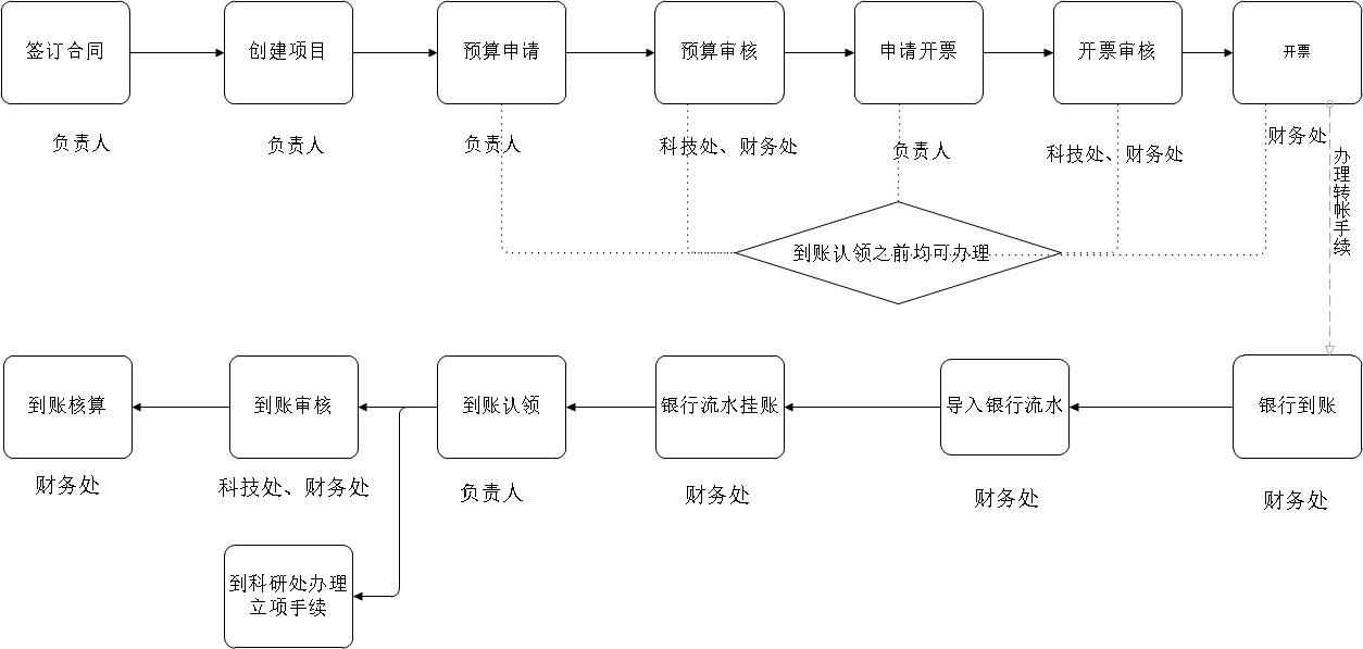 4.对于2018年12月31日之前到账的项目,财务处办理往来挂账手续,待科技处办理立项手续后,由计划财务处和科技处代为补建项目和补办理申请开票手续,其他流程不变。