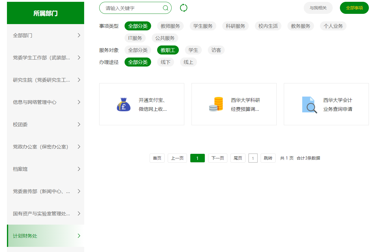 2、点击左侧菜单栏【计划财务处】,选择【西华大学科研经费预算调整申请】。