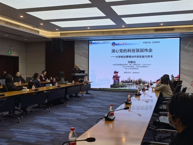 为提升我校科技管理服务工作质量,助推学校科研工作更上一个台阶,4月15日上午,学校在行政楼101报告厅召开了科技管理服务报告会。16U科技联盟第1-9届秘书长、第10届高级顾问何勤功教授受邀来校作了题为“潜心党的科技强国伟业——大学科技管理38年的实践与思考”的报告。各学院科研副院长、科研秘书、省级以上科研平台管理服务人员、科技处全体人员参加会议。报告会由科技处处长郎方年主持。