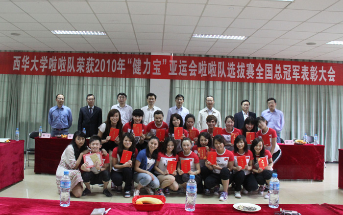 6月2日,我校啦啦队荣获2010年“健力宝”亚运会选拔赛全国总冠军表彰大会在体育馆北会议室召开,校党委书记张小南、校长孙卫国,校党委副书记王民朴、王小林,副校长蔡汉军、何建平、钱进、胡丹,体育学院全体领导以及啦啦队全体队员、跆拳道队队员代表、乒乓球运动员代表参加了表彰大会。大会由副校长何建平主持。