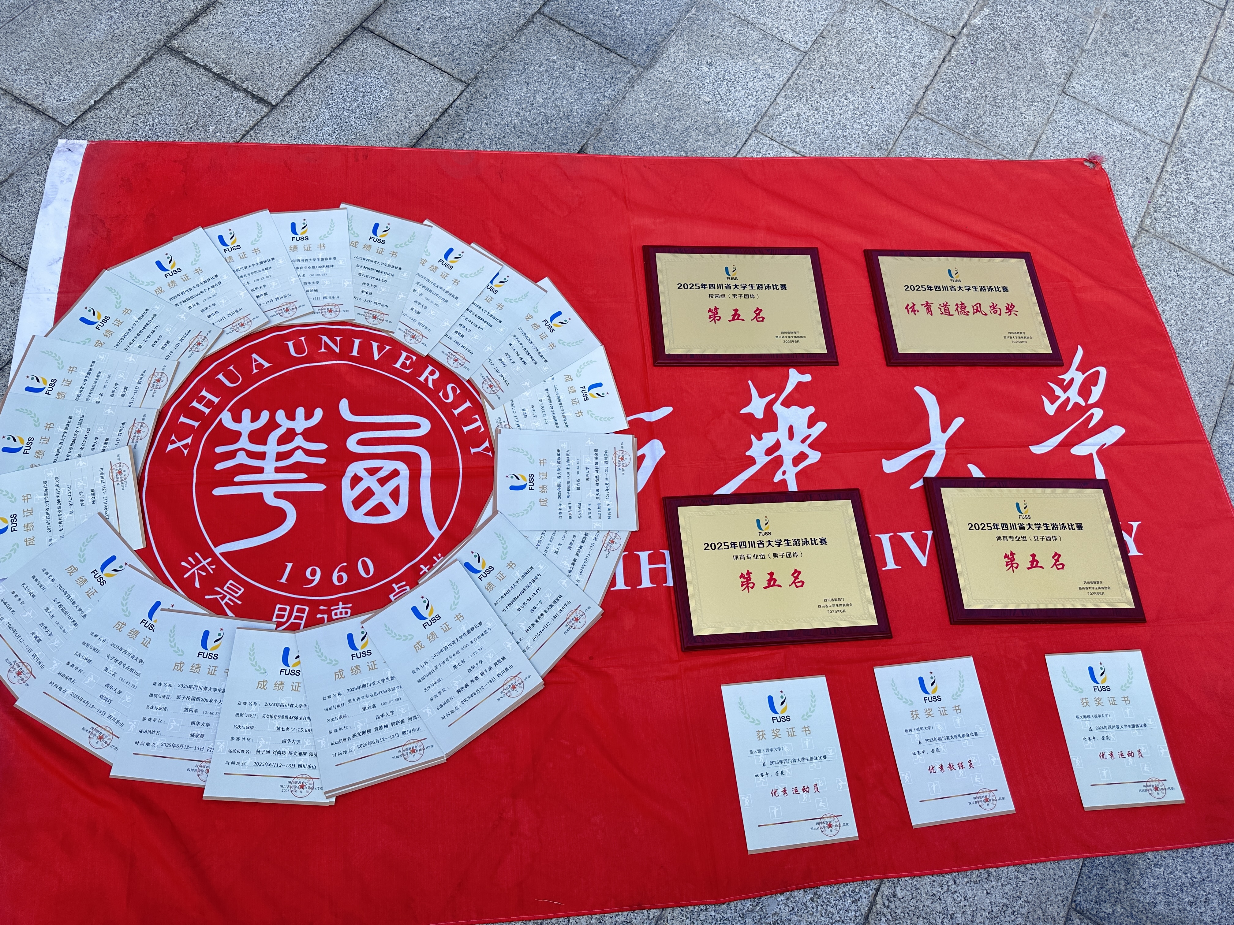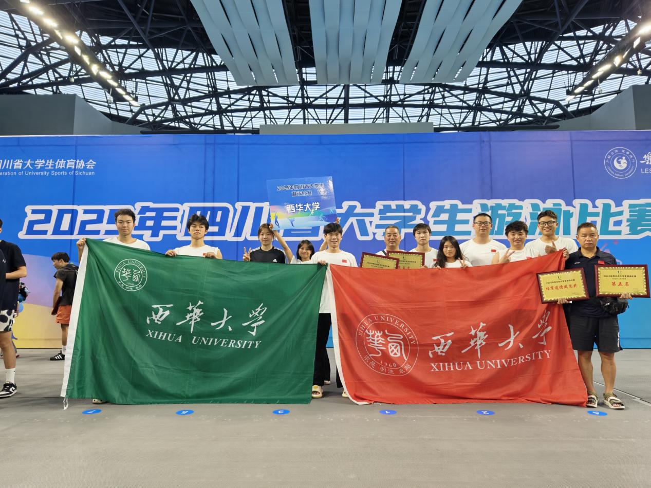 2025年6月11日至14日,2025年四川省大学生游泳比赛在乐山市举行,来自全省32所高校的数百名运动员同场竞技。我校游泳队在体育学院王立勇、杨树两位老师的带领下奋勇拼搏,最终斩获4枚金牌、3枚银牌、2枚铜牌,并荣获"体育道德风尚奖",展现了西华大学学子的卓越风采。