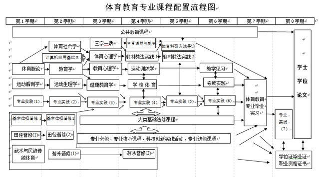 主要实践性教学环节:教材教法实践、教学见习、体育教育专业毕业论文、体育教育专业毕业实习、体育教育专业实践(1)(2)(3)(4)(5)(6)(7)、运动专项实践。