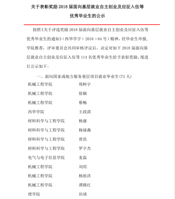 关于表彰奖励2018届面向基层就业自主创业及应征入伍等优秀毕业生的公示