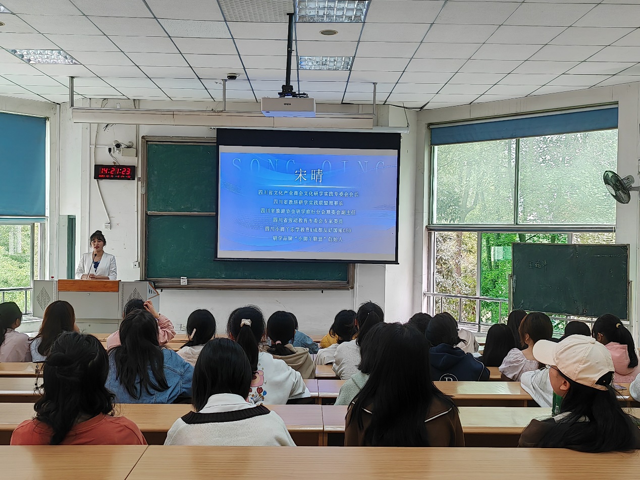 宋晴,西华大学外国语学院2014级MTI专业校友,现任四川小脚丫乐学教育 & 成都友好国旅 CEO。她分享的主题是“强内卷时代下,我如何C位出道?”。作为一名成功出道的创业者,她结合自己的丰富经验和心得,向我们介绍了在内卷时代如何脱颖而出,以便帮助我们更好地面对挑战。她指出,在强内卷时代,同学们需要有行动力,做到心态稳定、节奏稳定、理想稳定,方能破圈生长。