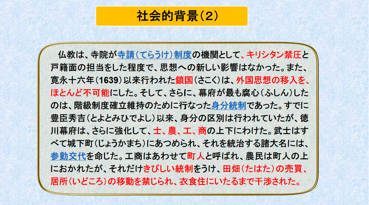 在讲解中主要对日本近世文学的文学概况进行了介绍。例如:当时的(1)寺請(てらうけ)制度、(2)身分統制、(3)参勤交代制度等。