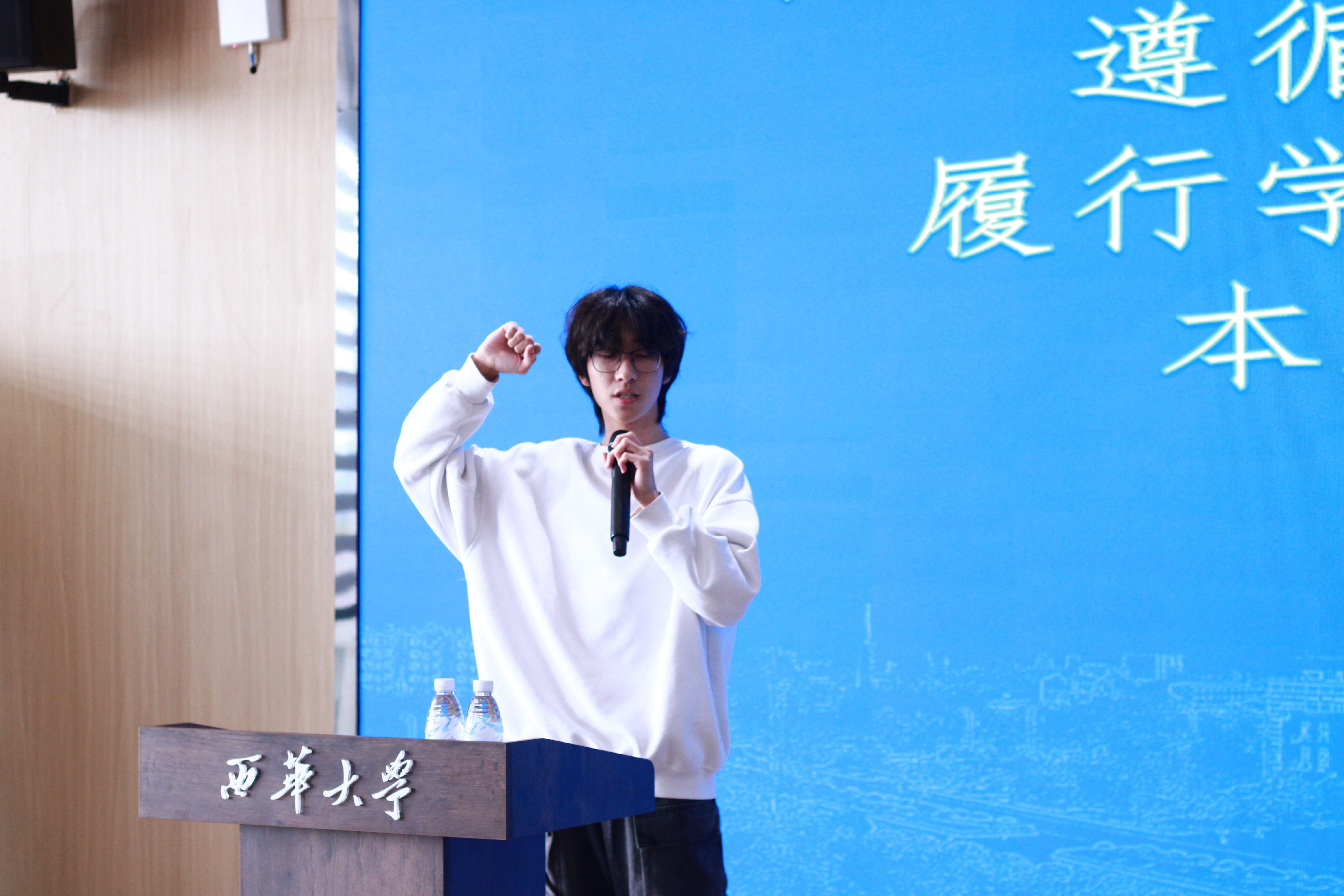 随后,外国语学院党委副书记万志昂教授发表了重要讲话。万志昂教授向西华大学外国语学院的学生干部提出了三点期望:首先,作为学生干部,应更善于读书、思考和服务于人,承担起政治责任,成为其他同学的榜样;其次,学生干部应有鲜明的个性和思维方式,面对困难时展现出责任感和奉献精神;最后,强调了服务他人的重要性,认为这是学生干部应有的美德,也是未来成为优秀人才的关键。万书记鼓励学生干部要有真才实学,积极面对挑战,为将来在激烈竞争中立于不败之地打下坚实基础。