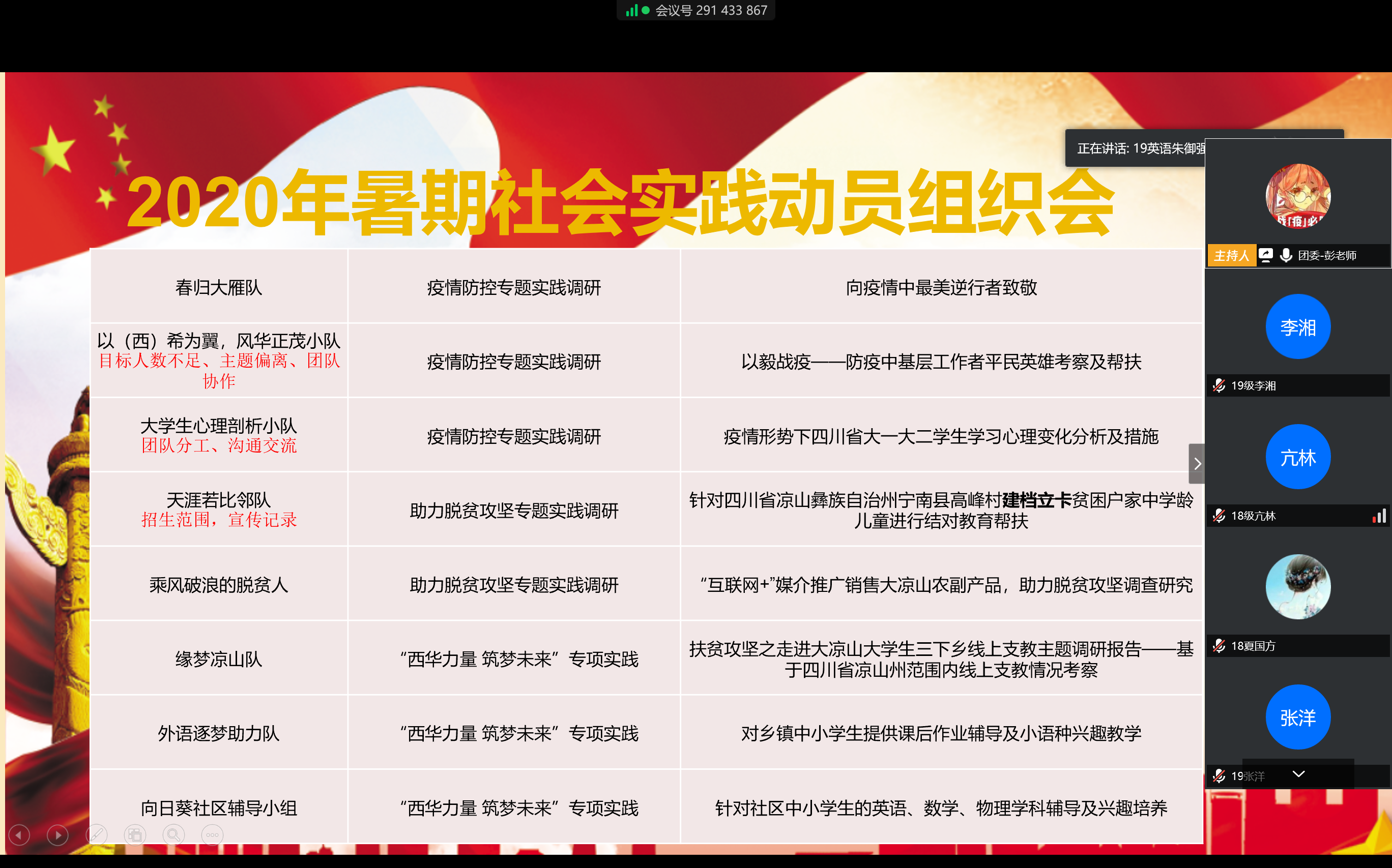 714日下午4:30,外国语学院在腾讯会议召开了2020年暑期社会实践活动动员大会,学院团委指导老师彭陈丽以及所有带队老师和队员参加了此次会议。会议由彭陈丽主持。