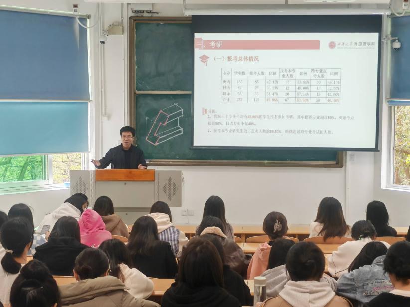 2024年10月23日,西华大学外国语学院在郫都校区成功举办了一场针对2025届本科生的“考研及就业指导与交流会”。本次交流会参会人员包括学院领导、教师以及英语、日语专业全体本科生。