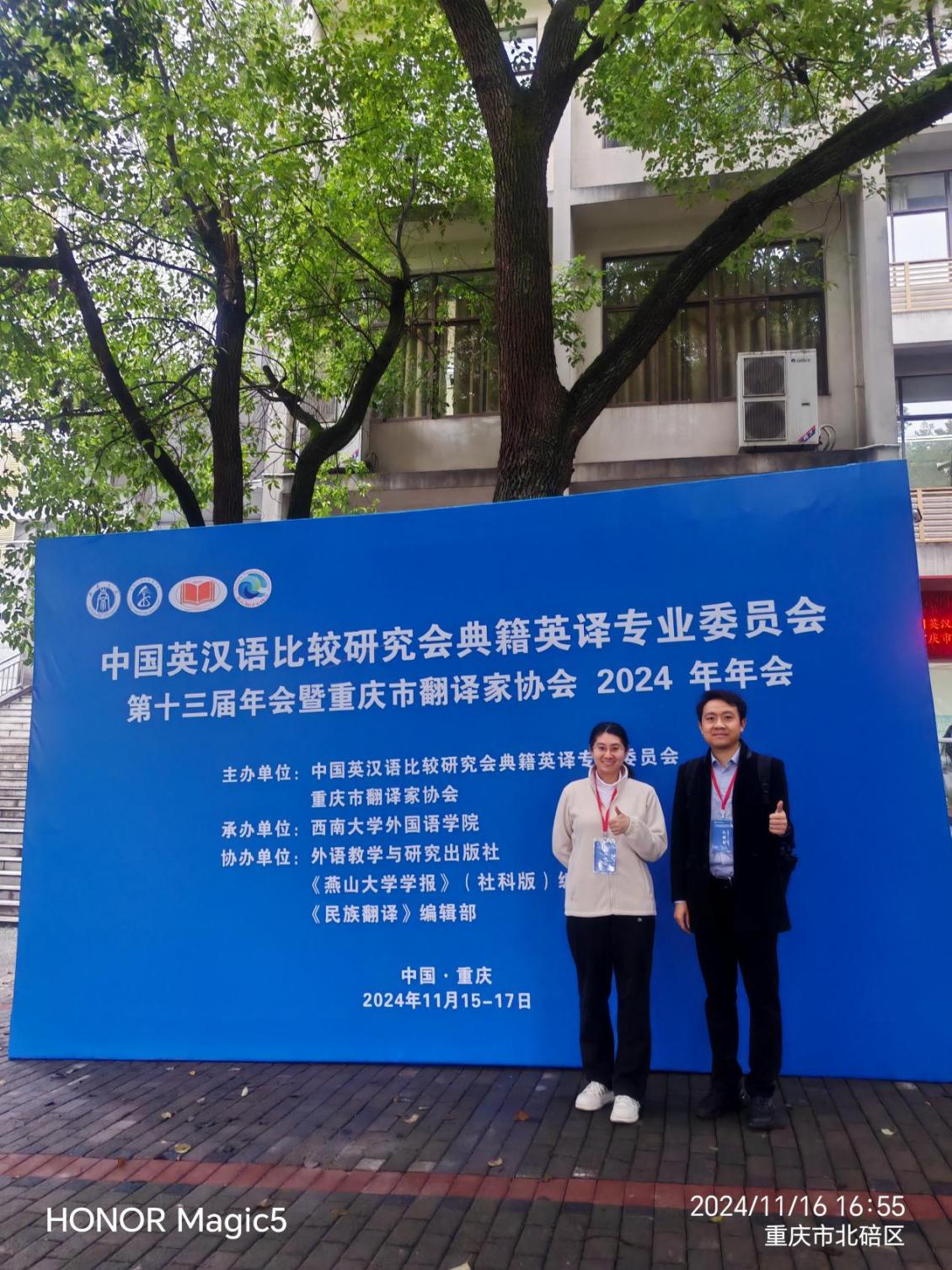 2024年11月15至17日,“中国英汉语比较研究会典籍英译专业委员会第十三届年会暨重庆市翻译家协会 2024年年会”在西南大学顺利召开,本次会议由西南大学外国语学院承办,外语教学与研究出版社、《燕山大学学报》(社科版)编辑部、《民族翻译》编辑部协办,来自全国各地院校代表共计200余人参会。我院英语系、翻译系教师梁勇博士与关宁博士参会并作报告。