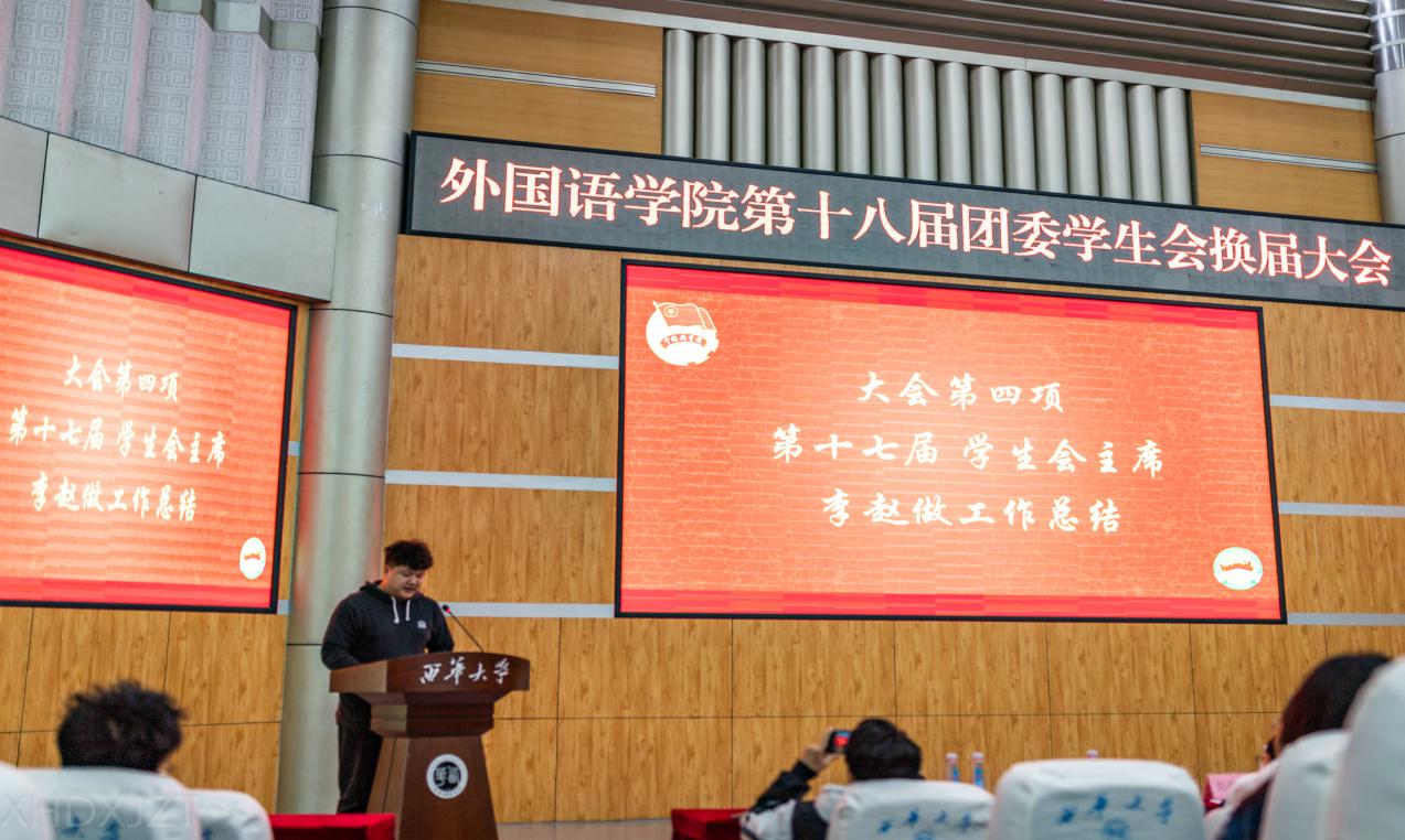 会议伊始,随着朝气蓬勃的中国共青团团歌响起,此次换届大会正式拉开序幕。通过团委学生会风采视频向大家展现了18届外国语学院团委学生会的卓越风姿。其次,第17届团委、学生会主席李赵回顾并总结了2019年团委学生会工作,提及到自身的收获与成长,他由衷的感谢诸位老师的栽培以及团委学生会给予他的发展机会。他表示团委学生会全体成员只有心怀整个团委、学生会组织,不断加强自身建设,才能真正做到学有所成,学有所获。