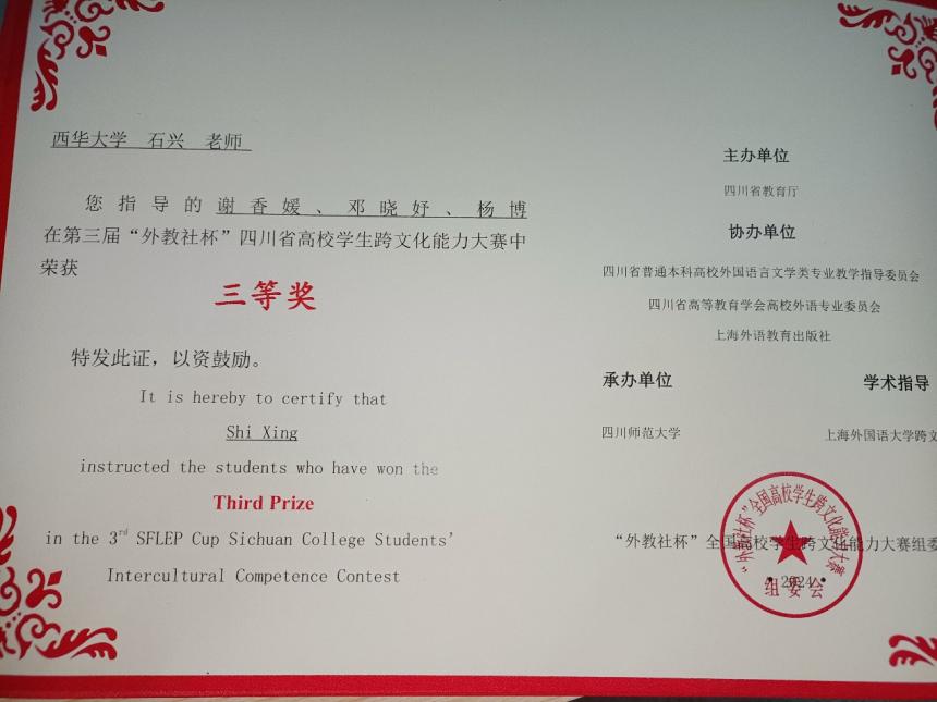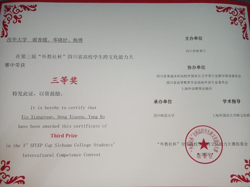 2024年11月,第三届四川省高校学生跨文化能力大赛——暨第七届“外教社杯”全国高校学生跨文化能力大赛四川赛区比赛圆满落幕,由我校外国语学院英语专业谢香媛、管理学院邓晓妤、法学与社会学院杨博三位本科学生组成的跨文化能力大赛参赛团队,在外国语学院指导老师石兴的悉心指导下,凭借扎实的学科功底和出色的跨文化沟通能力,荣获四川赛区三等奖。