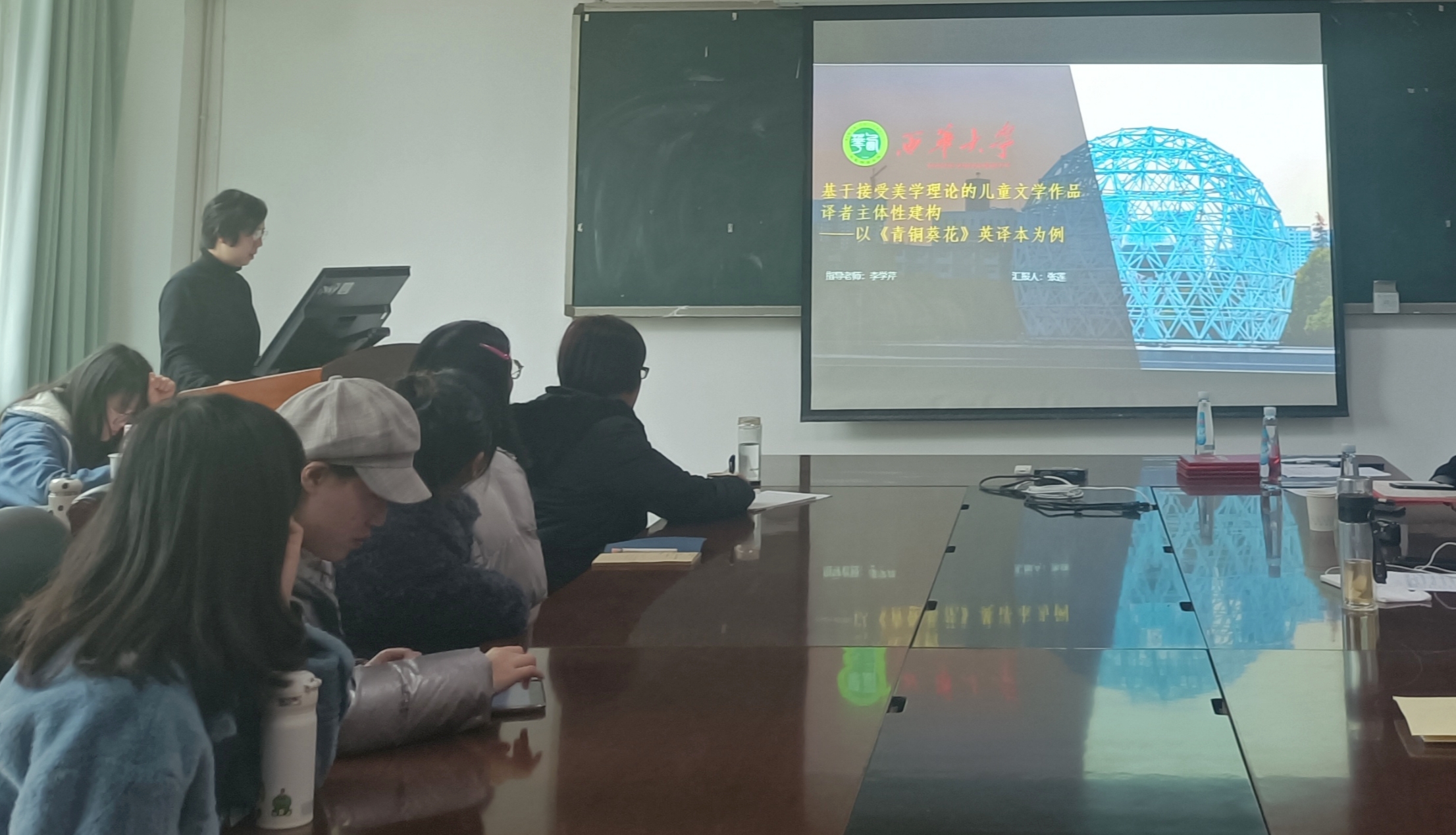 第四位进行论文分享的是2018级翻译专业硕士研究生张莲同学,其论文题目为《基于接受美学理论的儿童文学作品译者主体性建构—以《青铜葵花》英译本为例》。张同学总结了《青铜葵花》自出版以来,受到了国内外广大读者和学者们的青睐,并获得了国际儿童文学的最高奖项。张同学以《青铜葵花》的英译本为研究对象,从两个方面对译者主体性展开了研究。第一个方面,张同学从“接受美学”的角度出发,分析了译者主体性的具体表现,发现译者主体性在翻译过程中起着关键作用。另一方面,张同学从译者的角度,分析了影响译者主体性建构的两个主要因素。