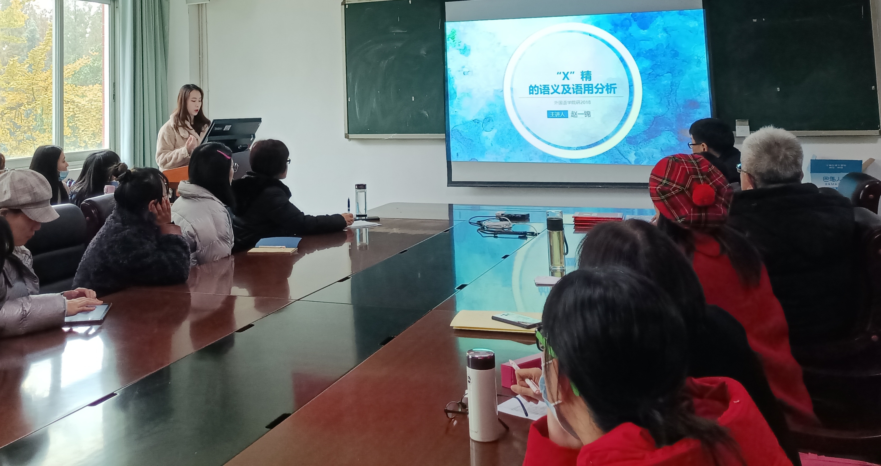 第一位进行论文分享的是2018级外国语言学及应用语言学专业研究生赵一锦同学,其论文题目为《“X精”的语义及语用分析》。通过搜集网民们频繁使用的“柠檬精”、“杠精”、“猪精”等“X精”网络流行词汇,赵同学分析了“X精”这一语言结构的语义及语用情况,并进一步探究了网民情感与网络流行语之间的关系。赵同学研究发现,“X精”形式满足了语言中的经济原则,其使用更能隐晦表达网民感情,有助于佐证近年来网民变得宽容、平和、幼稚的情感趋势,一定程度上反映出了语言和社会环境变化的动态关联性。
