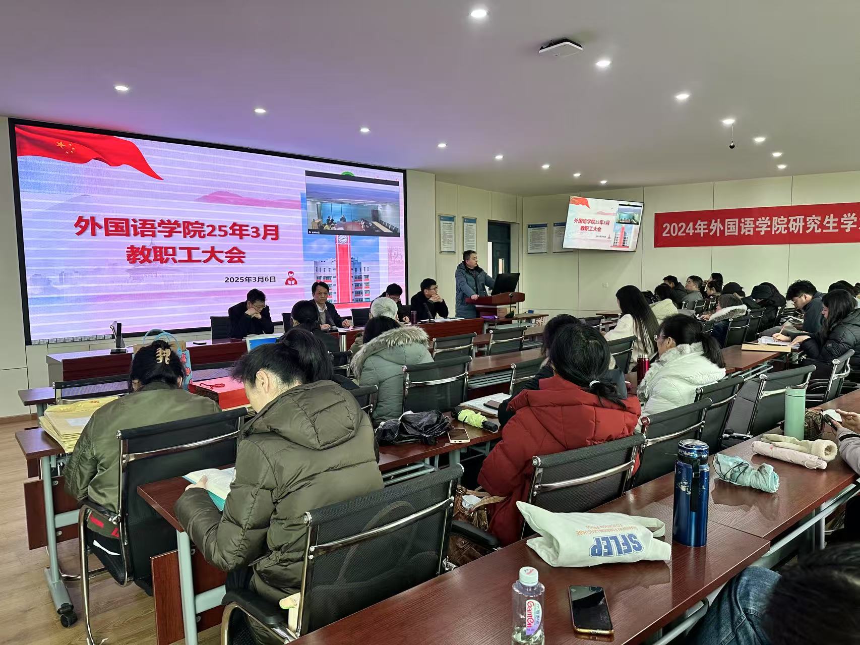 2025年3月6日下午,外国语学院全院大会在郫都校区4C504会议室和宜宾校区会议室同步举行。本次大会由学院党委书记唐润华主持,全体教职工参加。