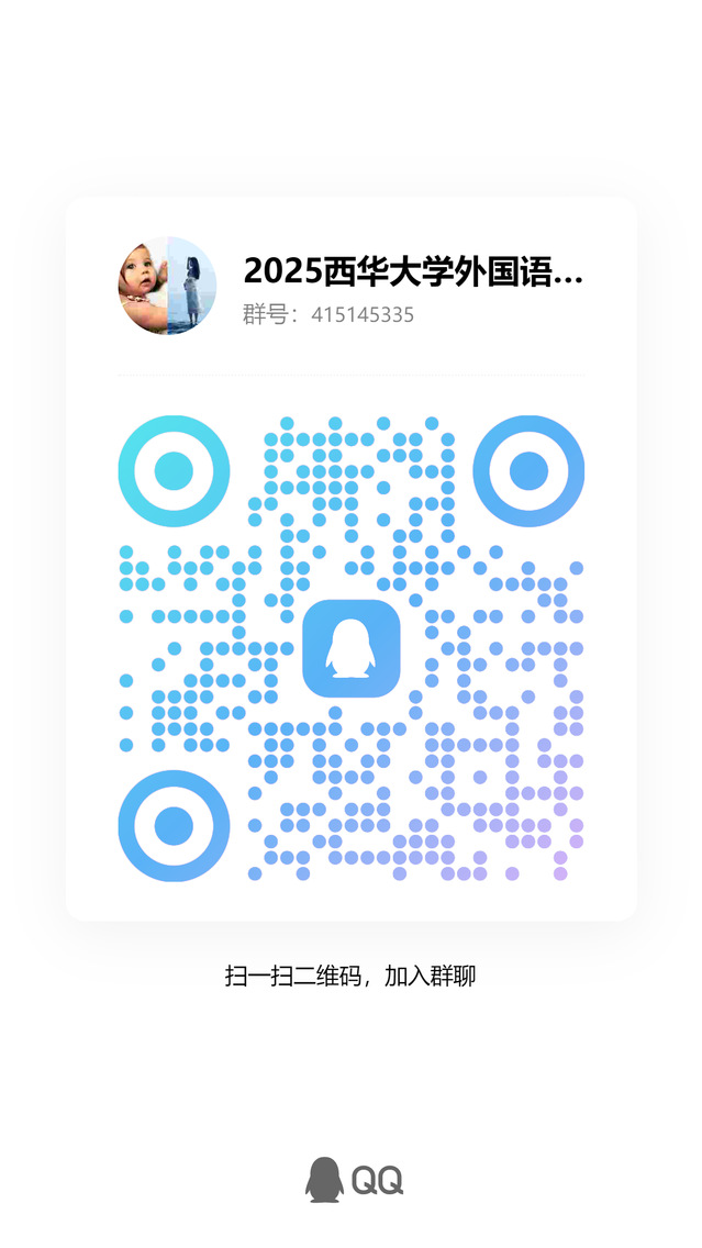 | 注:各位考生请注意,为了方便后续工作的开展,请你以“报考专业+姓名+身份证号后六位”加入QQ群:415145335(群名称:2025西华大学外国语学院复试)