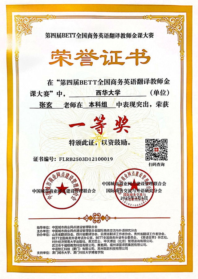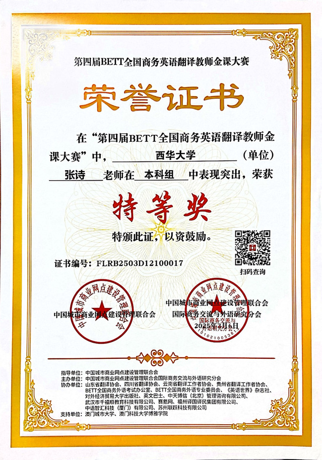 本次大赛由中国城市商业网点建设管理联合会下属的国际商务交流与外语研究分会主办,旨在推动商务英语翻译教学改革,于2024年8月启动,吸引全国百余所高校教师参与。两位教师的获奖反映出学院在应用型翻译人才培养和课程建设方面的努力和成效。