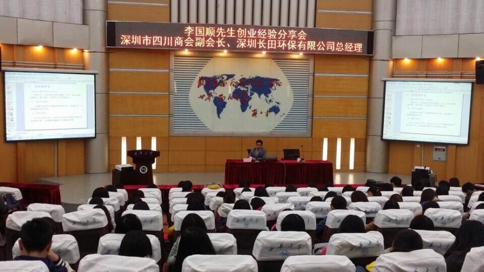 为切实做好大学生创新创业工作,鼓励大学生自主创业,外国语学院积极响应学校的号召,以学校创新创业宣传月为契机,开展创业宣传和经验分享活动。11月14日下午三点,深圳市四川商会副会长、深圳长田环保有限公司总经理李国顺先生在四教报告厅为同学们做了一场主题为“创新创业经验分享”的报告会。外国语学院党委副书记曾国勇、学院学工办主任王慧老师和2014级辅导员王丹丹老师参加了此次分享会。