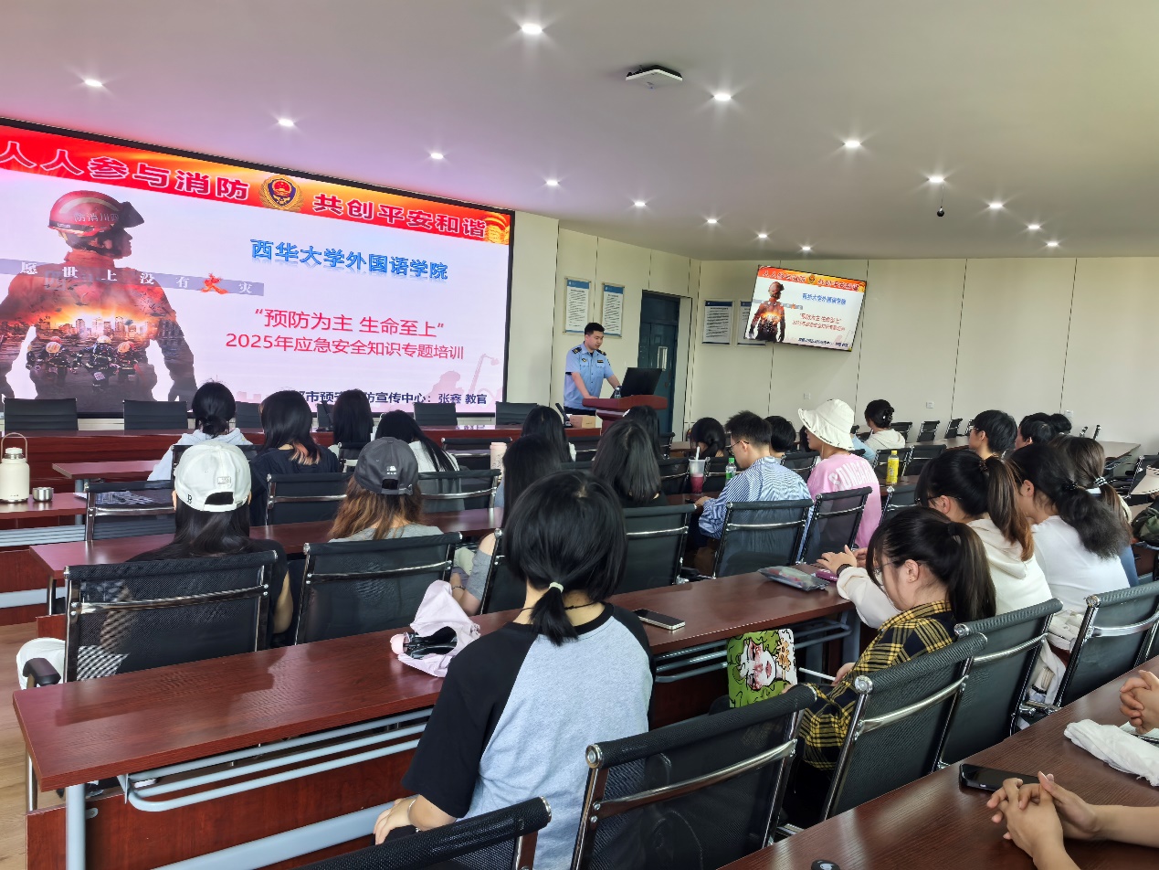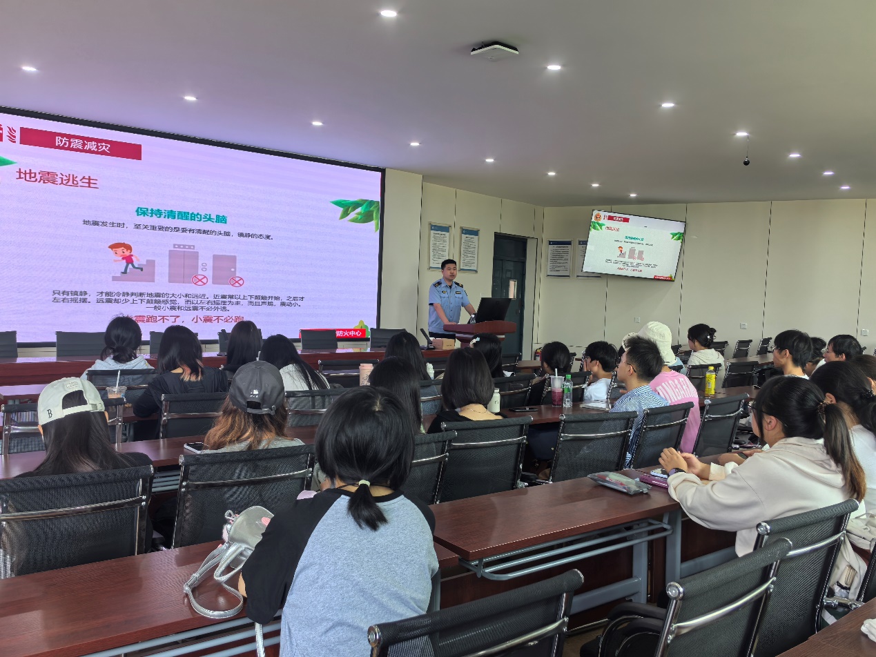 讲座伊始,一段2008年汶川地震的纪实视频带领师生回顾了自然灾害的破坏力,随后成都市预安消防宣传中心张教官结合地震灾害特点,详细讲解了“伏地、遮挡、手抓牢”的室内避险原则,以及户外远离建筑、桥梁、电线等危险区域的逃生要点。他强调,冷静判断和正确动作是地震中保护生命的关键。