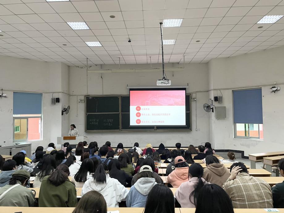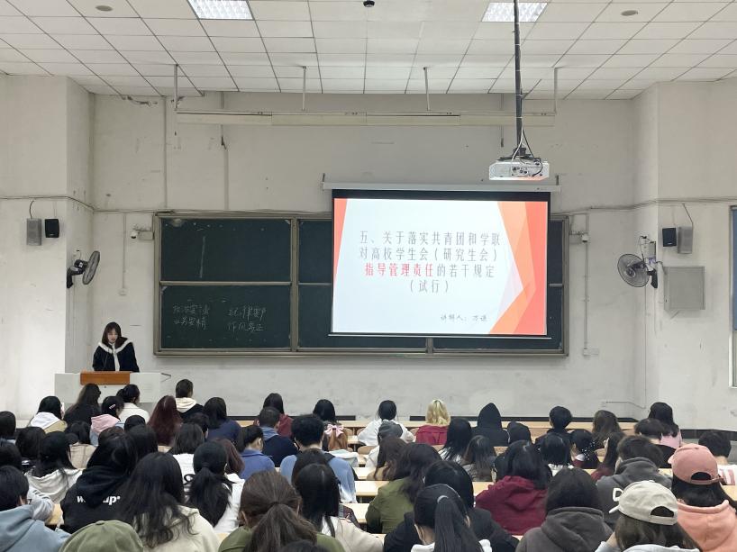 其后,由团委副书记和主席团成员依次详细讲解改革规章与议程安排。从如何全面规范学生会、如何进行基层团组织建设以及如何做好一个基层干部的重要内容进行具体阐述。不仅说明了学生会内部推优入党试行的标准,着重强调了选拔时加强对学业方面的考核力度;同时向同学们解说了《关于落实共青团和学联对高校学生会(研究生会)指导管理责任的若干规定(试行)》,阐明了高校团委的指导责任,对团组织、学联组织的责任追究方式。这警醒了各位学生骨干应当恪守学生本分、牢记服务宗旨、永葆理想情怀、勤勉务实做事、秉持平等态度、摒弃庸俗习气,积极营造浓厚的学习氛围。最后,根据深化高校共青团改革要求,主席们作出要求、指明方向、详尽列举出几条建议,再三强调贯彻落实习近平新时代中国特色社会主义新时代思想的重要性。