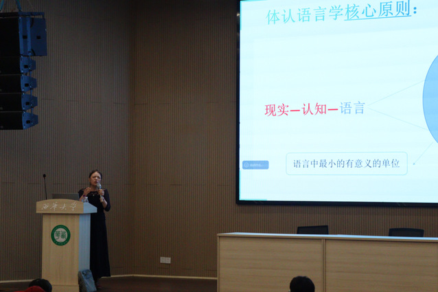 (图为李瑛教授开场阐述体认语言学理论框架)