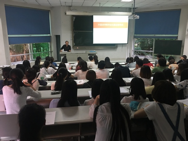 5月11日晚,外国语学院在4B201教室召开2013级学生就业指导大会。学院党委副书记罗海,学院就业联系人、2013级辅导员曾渝理以及2013级部分学生参加了本次指导会。