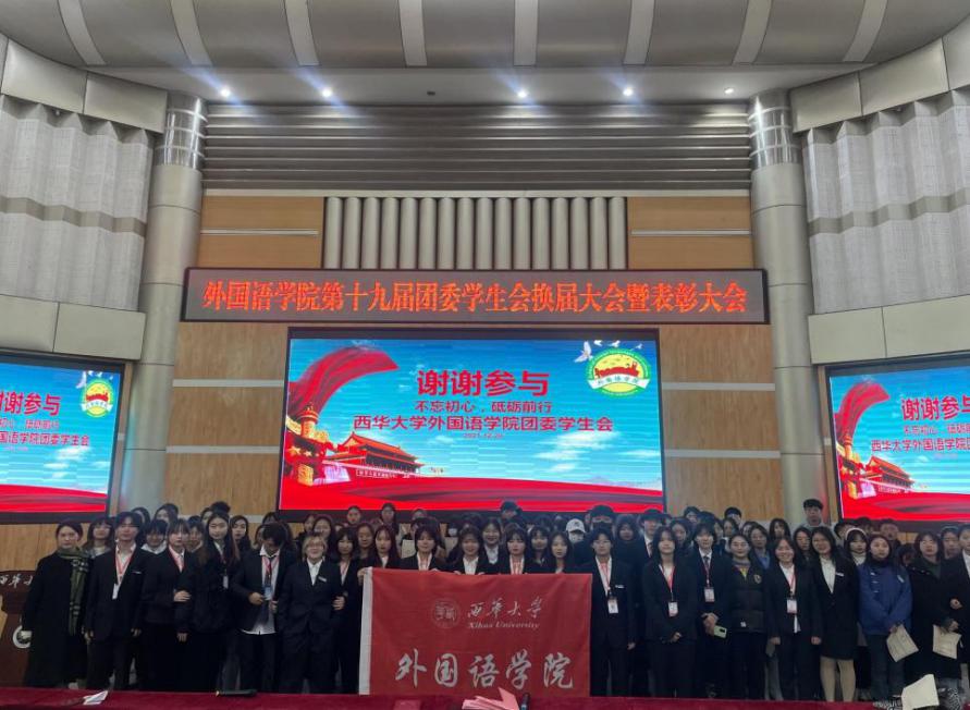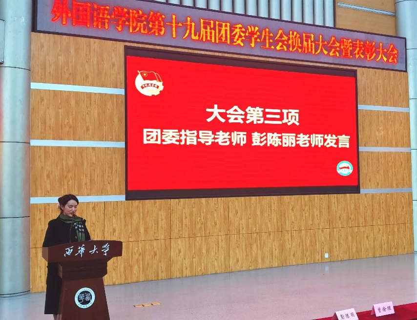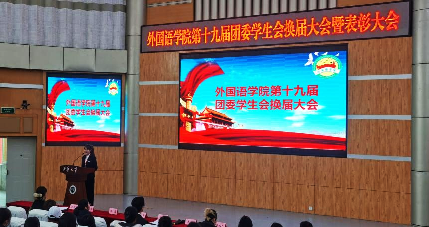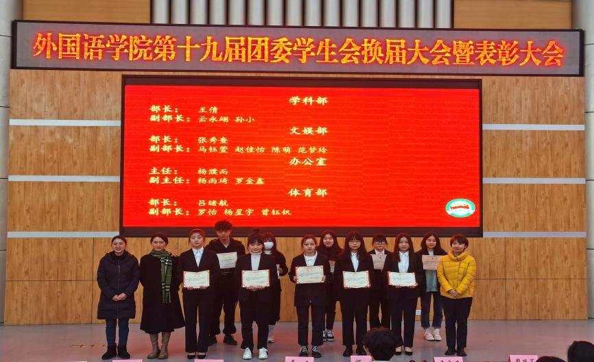 12月20日12时30分,外国语学院第十九届团委学生会换届暨表彰大会在四教报告厅举行。本次大会由院团委学生会主席向孝艺族主持,院学生党总支书记、学工办主任曾渝理、就业指导老师杨磊、团委指导老师彭陈丽、团委学生会全体成员以及各兄弟学院代表参加本次大会。