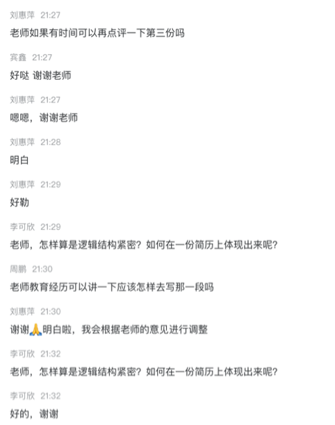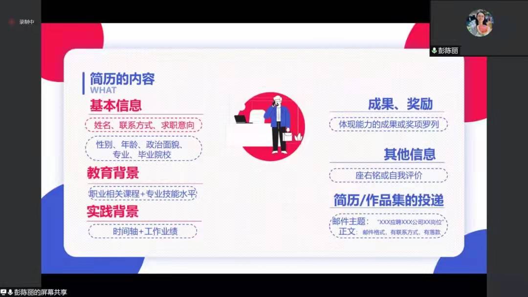 12月10日晚8点,由外国语学院团委指导老师彭陈丽老师主讲的简历制作培训会在腾讯会议线上开展。会议主要分为三个部分:简历撰写思路、简历制作基础内容和参赛简历点评。此外,彭老师还耐心回答了大家的提问,让更多的同学了解到怎样制作一份精美的简历,提高自己的职场竞争力。