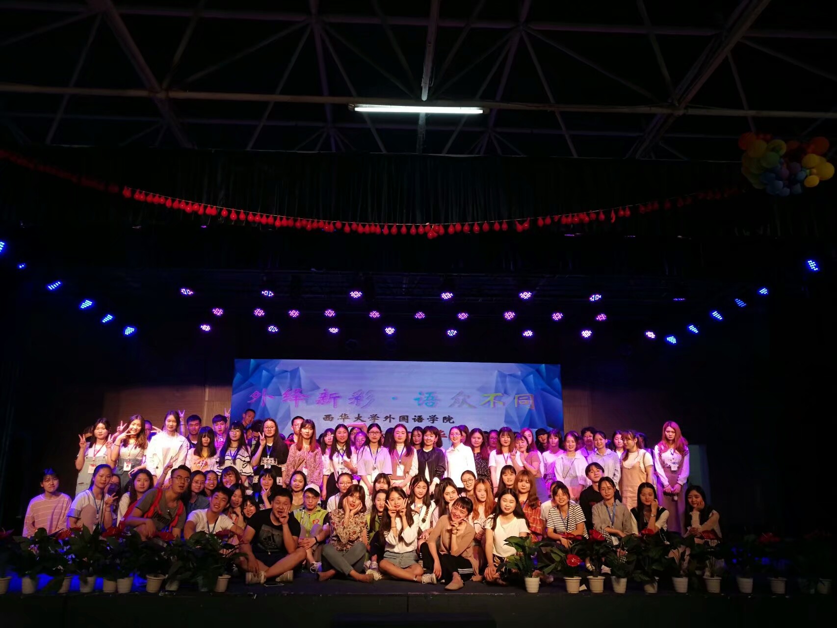 4月22日晚7点,外国语学院在学生活动中心三楼成功举办“诗情话西华”文艺汇演暨外语文化活动月开幕式。学院团委书记曾渝理老师、辅导员杨磊老师、各兄弟学院主席团代表应邀出席,学生会全体成员及2017级全体同学到场观看。